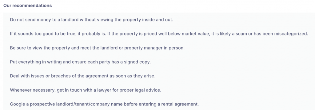 Many rental platforms engage in the sharing of tenant’s personal information, often for credit reports and rental applications. Before providing any personal information, carefully review the platform’s privacy policy and ensure your account is secure. This can be done by creating a strong password, opting for verified listings, and not clicking on suspicious links provided by 3rd parties.